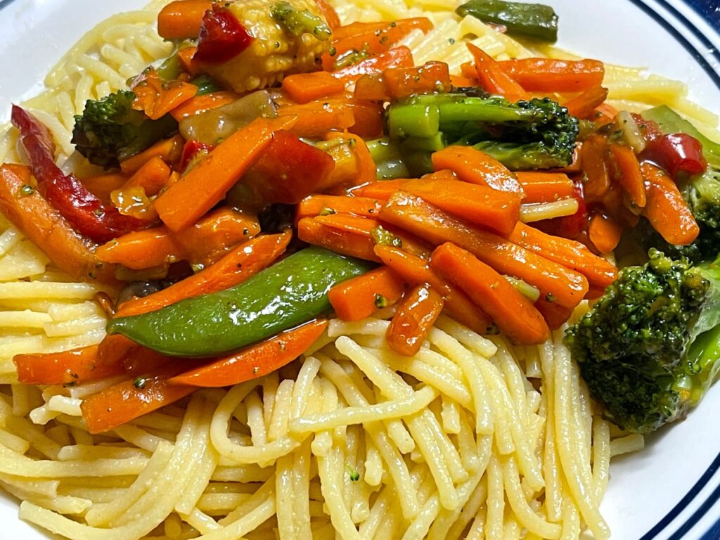 This vegetable-forward pasta dish is light, fresh, and budget-friendly. Whatever vegetables you have get tossed with pasta and a simple garlic-butter sauce. The vegetables add color, nutrition, and texture to the dish.