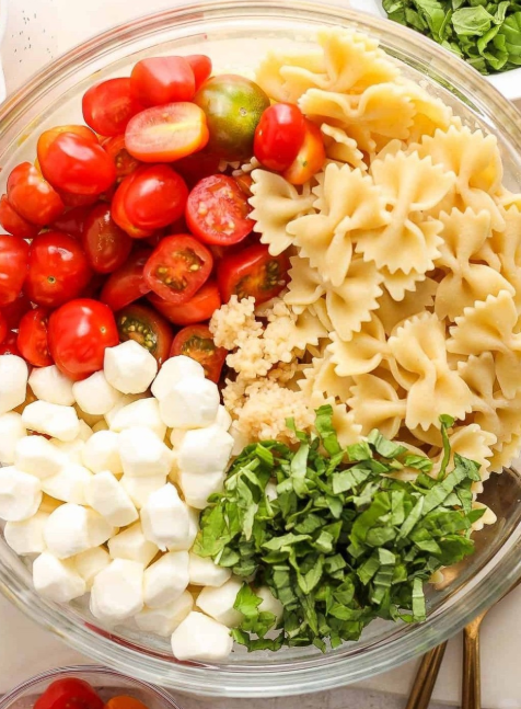 2. In a large bowl, combine pasta, tomatoes, mozzarella, and basil.