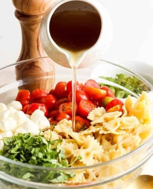 Pour the dressing over the cooled pasta, tomatoes, basil, and mozzarella. Toss gently until everything’s coated and shiny. Taste again for seasoning—this is where you add a pinch more salt or a grind of pepper if it needs a little something.