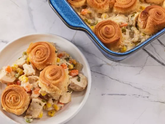 All the deliciousness of chicken pot pie without the fussy pastry work. Tender chicken and mixed vegetables swim in a rich, creamy sauce that tastes like a warm hug. Instead of a traditional pie crust, this version typically uses biscuits or puff pastry on top, making it much easier to assemble.
