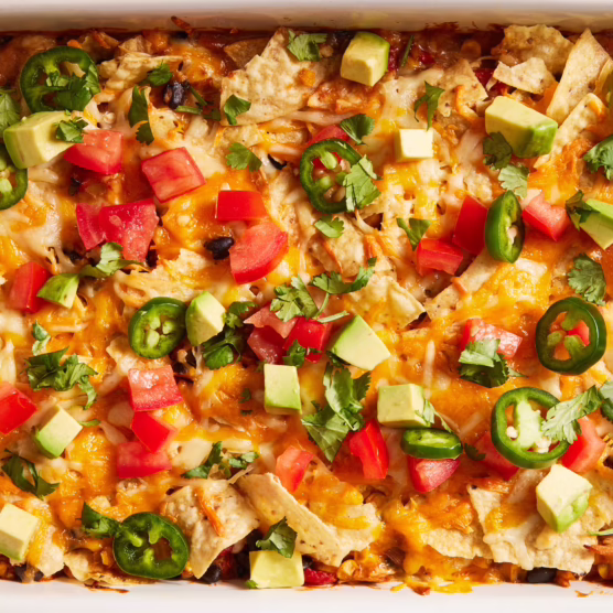 Layers of tortillas, seasoned chicken, beans, and cheese create a fiesta of flavors in every bite. This casserole has all the elements of your favorite Mexican dishes without any of the complicated assembly.