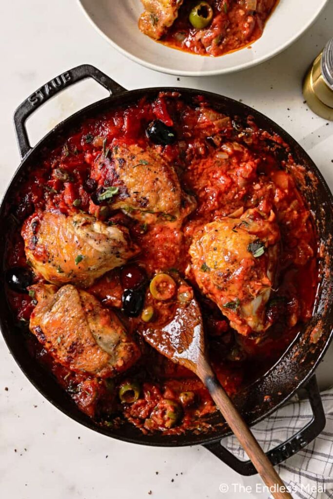 Chicken thighs braised in tomatoes and olives tastes Mediterranean and elegant. The olives add brininess that makes everything taste more complex. This cooks slowly in one pot so it’s easy cleanup. The sauce is perfect for sopping up with bread. Even cheap olives from a jar work fine. This feels like vacation food but costs very little.