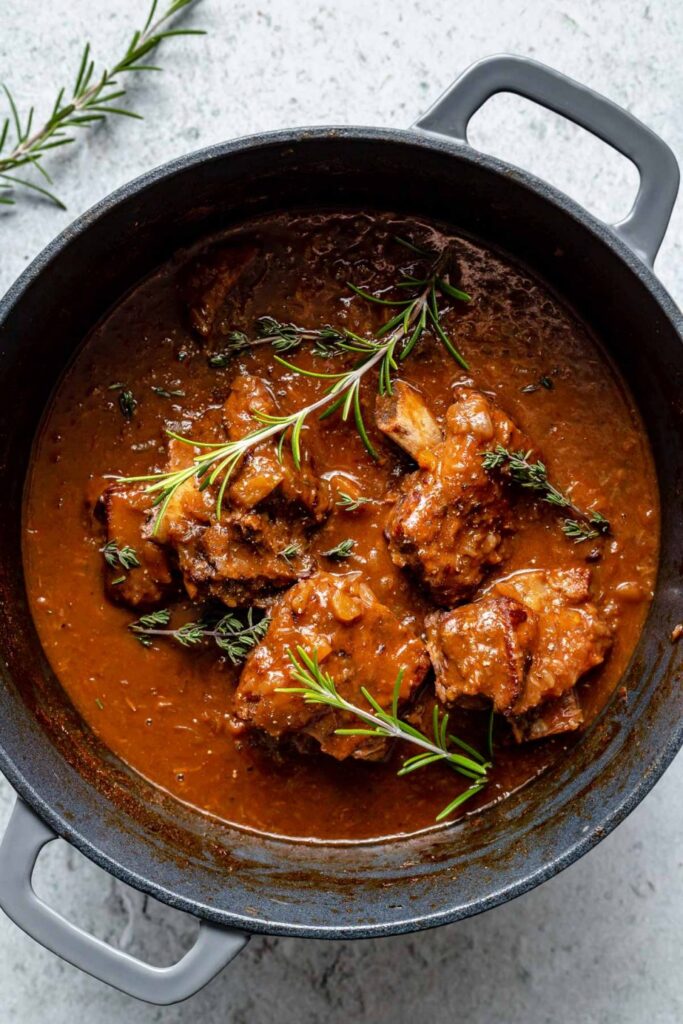 Short ribs are cheap when you find them on sale and braising makes them fall-apart tender. The wine doesn’t have to be expensive – cooking wine works fine. This takes a few hours but most of that is hands-off braising time. The meat gets so tender you can cut it with a fork. Serve with mashed potatoes to soak up the amazing sauce.