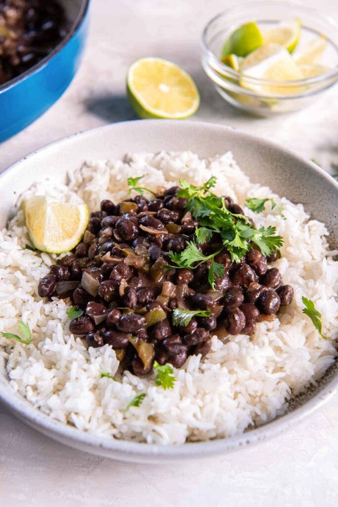 Dried black beans are super cheap and way more flavorful than canned. The sofrito base of onions, peppers, and garlic is what makes this authentic. Let the beans cook slowly until creamy. This is comfort food that’s filling and satisfying. The rice stretches the beans to feed more people. Top with cilantro and lime for freshness.