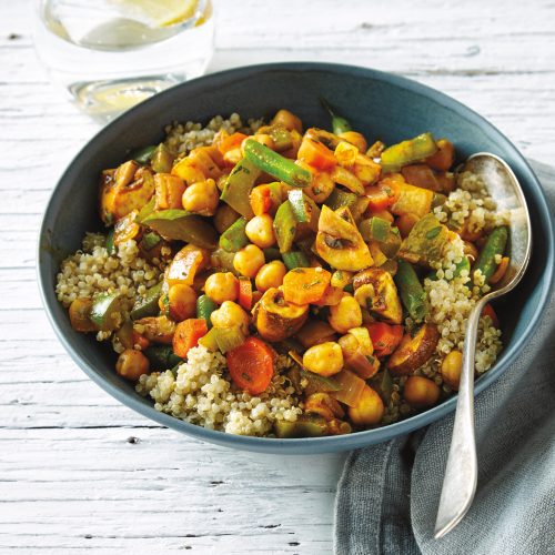 Canned chickpeas and whatever vegetables need to be used up make this hearty stew. The spice blend is what makes it special – cumin, cinnamon, ginger, paprica. Let it simmer slowly so all the flavors meld together. Serve over couscous or rice. This is filling, healthy, and tastes exotic without expensive ingredients. Gets better the next day too.