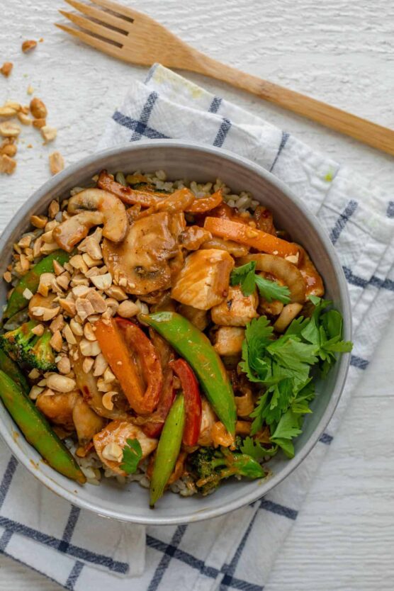 Craving takeout? This stir-fry delivers all those craveable Thai flavors without leaving your kitchen. The peanut sauce is creamy, slightly sweet, and has just the right amount of heat that you can adjust to your liking. It comes together lightning-fast, especially if you prep your veggies ahead of time.