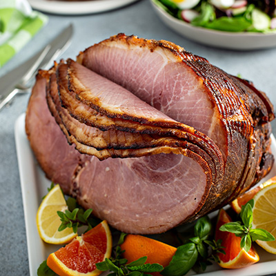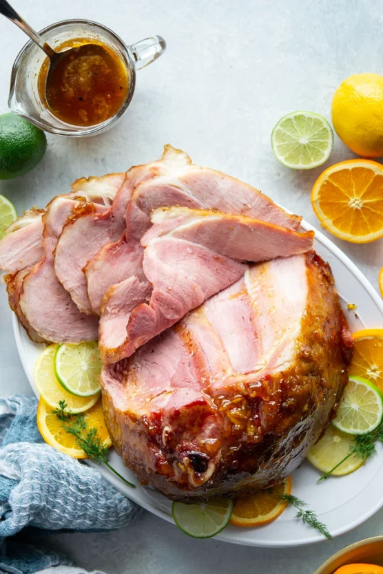 This succulent ham features a beautiful golden glaze made with honey and fresh citrus juices that caramelizes during baking, creating an irresistible sweet-tangy coating. The combination of orange and lemon zest adds bright, aromatic notes that perfectly complement the rich, smoky ham. Slow-roasted to tender perfection, each slice delivers a balance of savory meat with the glossy, flavorful glaze that makes this dish a showstopper for holiday gatherings and special occasions.
