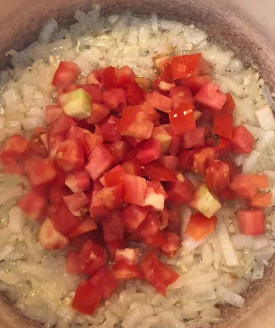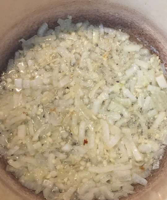 - Heat avocado oil in a large pot over medium heat. Add onion and sauté 5 minutes until soft and golden.