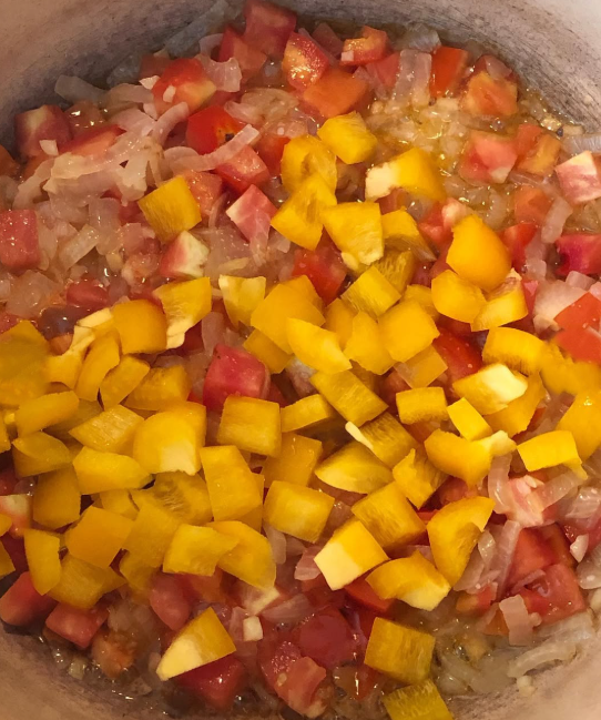 - Add diced tomato and red pepper. Stir well, reduce heat, cover, and simmer 15–20 minutes, stirring occasionally.