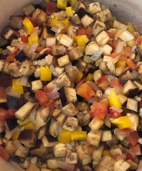 - Stir in eggplant and a pinch of salt. Cook 8–10 minutes, stirring occasionally, until softened and lightly golden.
