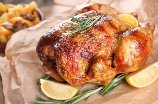 A whole roasted chicken seasoned with fresh herbs and lemon is foolproof elegance. The skin crisps beautifully while the meat stays juicy and flavorful throughout. Fresh rosemary, thyme, and garlic infuse every bite with aromatic goodness.