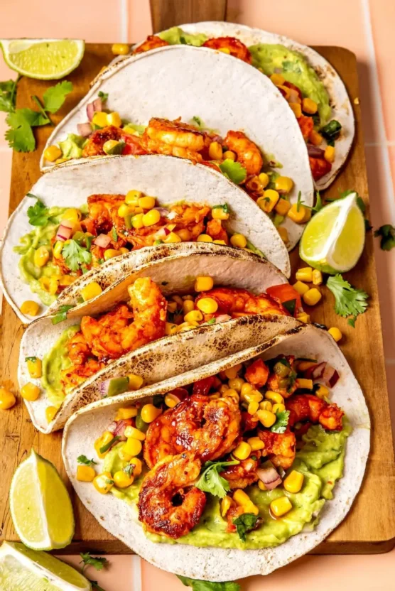 Quick-cooking shrimp seasoned with chili powder and cumin make these tacos weeknight-friendly. Corn tortillas are naturally gluten-free and bring authentic Mexican flavor. Top with crunchy cabbage slaw, creamy avocado, and tangy lime crema for textural contrast.