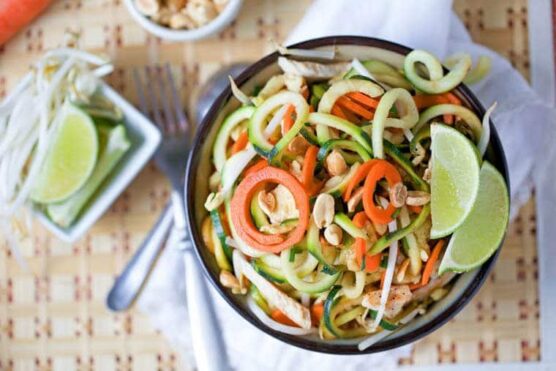 Traditional pad thai gets a veggie-packed twist with spiralized zucchini standing in for rice noodles. The zucchini soaks up the tangy, sweet, and savory sauce while maintaining a satisfying texture. Topped with peanuts, bean sprouts, and lime, it delivers all the classic flavors you crave.