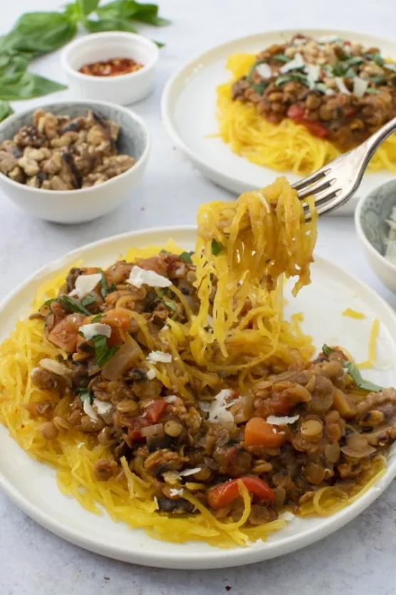 Roasted spaghetti squash strands replace traditional pasta in this vegetable-forward take on bolognese. The squash has a mild, slightly sweet flavor that pairs perfectly with rich meat sauce. It’s substantially lower in carbs than pasta while still providing that noodle-like experience.