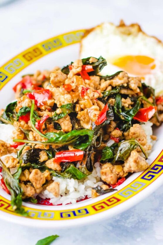 This aromatic stir-fry balances savory, sweet, and slightly spicy flavors perfectly. Ground chicken cooks quickly with garlic, chilies, and plenty of fresh Thai basil. Fish sauce and a touch of sugar create that distinctive Thai flavor profile. Served over jasmine rice, it’s a complete meal that feels restaurant-quality.
