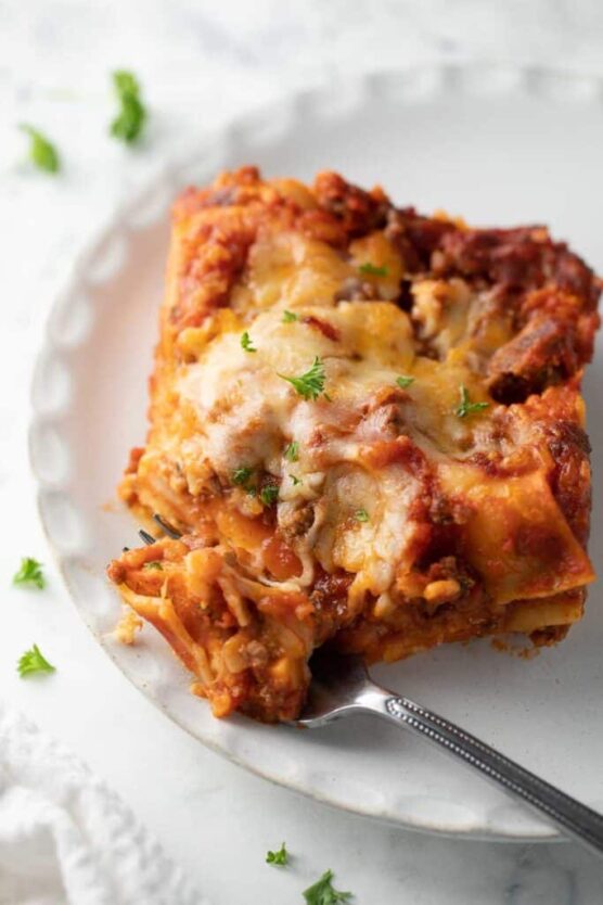 The sauce simmers with tomatoes, herbs, and ground beef for deep, complex flavor. Topped with Parmesan, it’s comfort food that feels lighter and more nutritious.