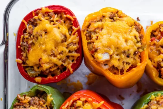 Colorful bell peppers become edible bowls for a savory filling of ground meat, rice, and tomatoes. They bake until the peppers are tender and the filling is hot and bubbly. Topped with melted cheese, they’re comforting and visually appealing. The peppers themselves add natural sweetness and vitamins to the meal.