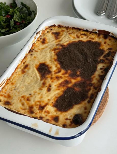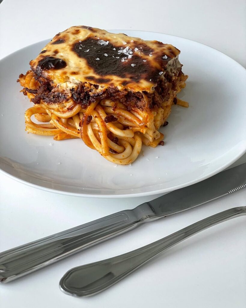 - Preheat oven to 375°F (190°C). In a baking dish, layer pasta, meat sauce, then béchamel.