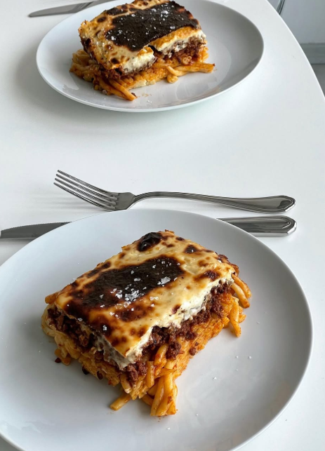 This Greek Pasta Bake is one of those dishes that looks fancy but feels like home. It’s basically the Greek cousin of lasagna—pasta on the bottom, savory cinnamon-scented meat sauce in the middle, and a rich, cloudlike béchamel on top.