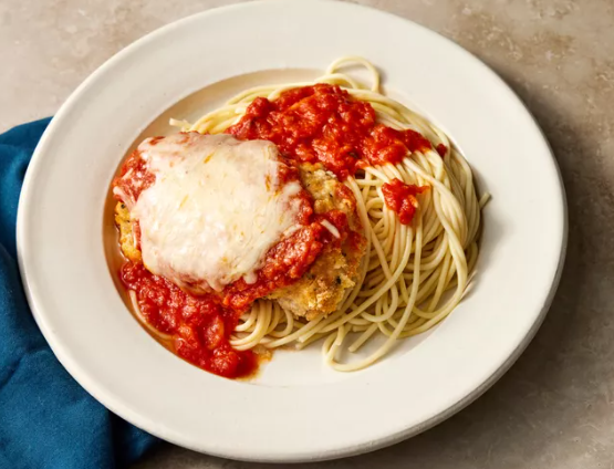 Chicken breasts get a light coating of breadcrumbs and bake instead of frying. The result is still crispy on the outside and juicy inside, topped with marinara and melted cheese. Using part-skim mozzarella keeps the fat in check without sacrificing that gooey, melty factor.