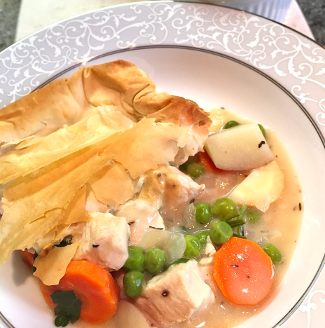 This beloved comfort food gets a makeover with a lighter filling and a single puff pastry crust on top. The creamy sauce uses milk thickened with flour instead of heavy cream. All the classic vegetables—carrots, peas, celery—are there making each bite satisfying.