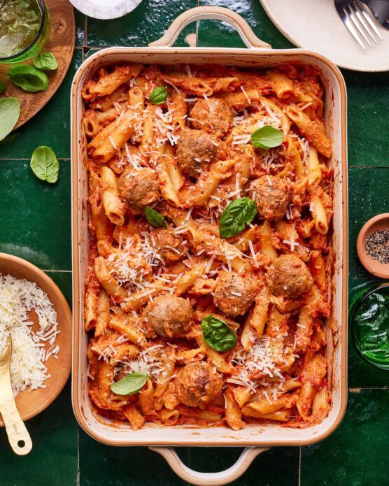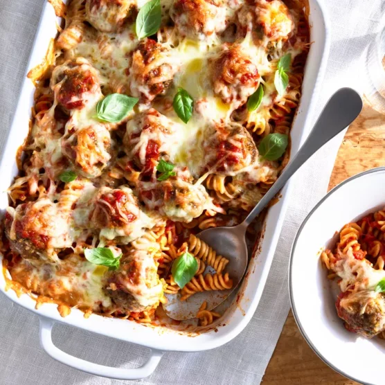 This baked pasta dish combines tender penne with meatballs in marinara, all topped with bubbling cheese. It’s essentially a deconstructed lasagna that’s much easier to throw together. The pasta absorbs the sauce while baking, creating incredible flavor in every bite.