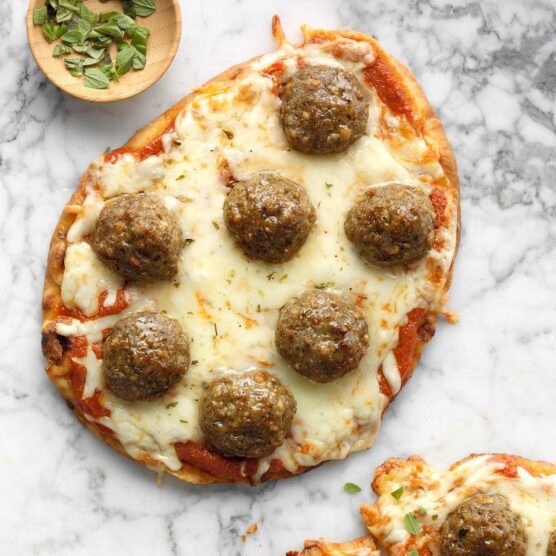 You can use homemade or store-bought dough and pre-cooked meatballs for a super quick dinner that feels special.