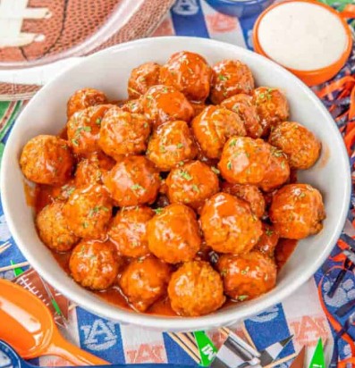 For those who love spicy, tangy buffalo sauce, these meatballs deliver all that flavor without the mess of wings. Toss them in buffalo sauce and serve with cooling ranch dressing for dipping. They’re perfect over rice, in subs, or just on their own as an appetizer.