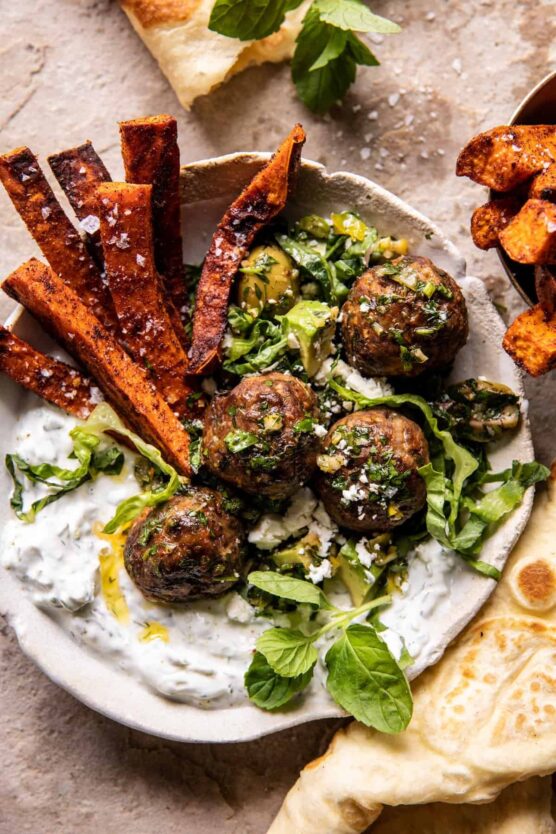 Flavored with oregano, mint, and garlic, these Mediterranean meatballs are bright and herbaceous. The cool, creamy tzatziki sauce provides the perfect contrast to the warm, spiced meat. Serve them in pita pockets, over rice, or with a Greek salad for a lighter dinner option.