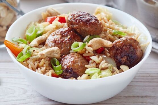 These Asian-inspired bowls bring restaurant flavors home with minimal effort. The meatballs get glazed in homemade or store-bought teriyaki sauce and served over fluffy rice with steamed veggies. It’s a complete meal in one bowl that’s both satisfying and balanced.