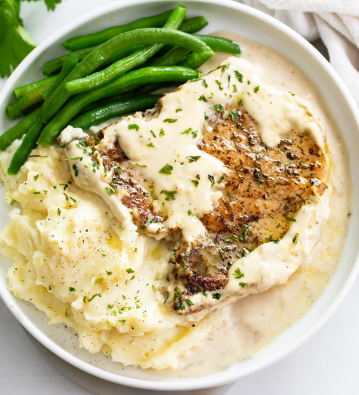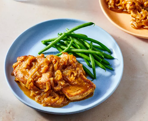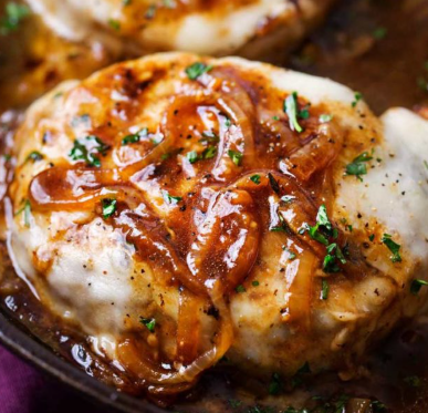 This takes inspiration from the beloved soup, topping pork chops with caramelized onions and melted cheese. The combination of sweet onions, rich beef or chicken broth, and gooey cheese is irresistible. A splash of wine in the sauce adds depth and authenticity to the French onion flavor.