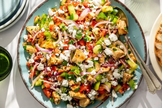 Bright Mediterranean flavors shine through with juicy tomatoes, crisp cucumbers, briny olives, and creamy feta cheese. Adding grilled chicken transforms the traditional Greek salad into a protein-packed dinner that’s light yet filling.