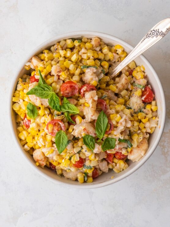 Sweet grilled corn and smoky shrimp create a summery combination that’s light but surprisingly substantial. The char on both the shrimp and corn adds depth of flavor that elevates simple ingredients.