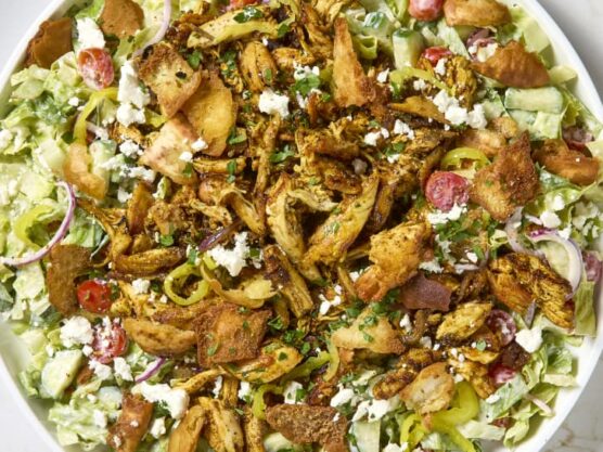 Sweet and smoky BBQ chicken mingles with corn, black beans, tomatoes, and crispy tortilla strips in this crowd-pleasing bowl. The chopped format ensures you get a perfect mix of ingredients in every bite rather than hunting for toppings.
