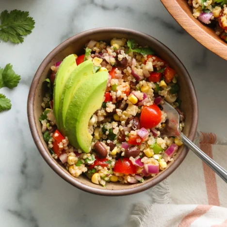 This plant-based powerhouse combines protein-rich quinoa and black beans with fresh vegetables and a zesty lime dressing. The textures are wonderfully varied, with fluffy quinoa, creamy beans, and crunchy peppers all playing together.