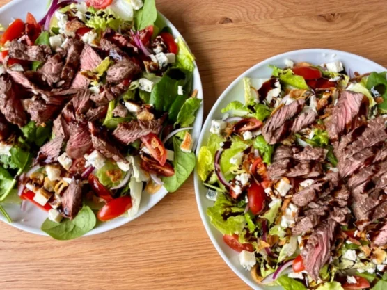 Juicy sliced steak paired with tangy blue cheese crumbles makes this salad feel like a steakhouse experience at home. The peppery arugula and mixed greens balance the richness perfectly, while a balsamic vinaigrette ties everything together.