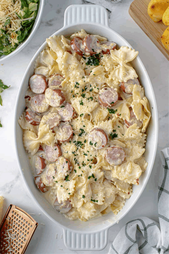 Creamy, dreamy, and dangerously addictive, this pasta dish is pure indulgence. The rich Alfredo sauce clings to every noodle while chunks of sausage add substance and a savory contrast to the cream.