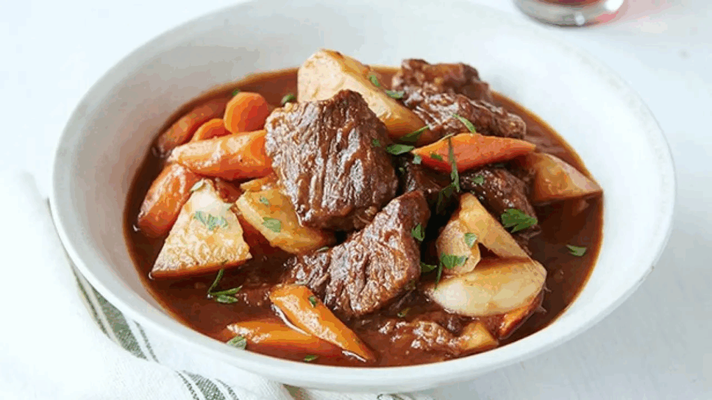 This French bistro classic turns humble beef into something extraordinary through red wine and time. Tender chunks of beef nestle among pearl onions, mushrooms, and bacon in a silky wine sauce.