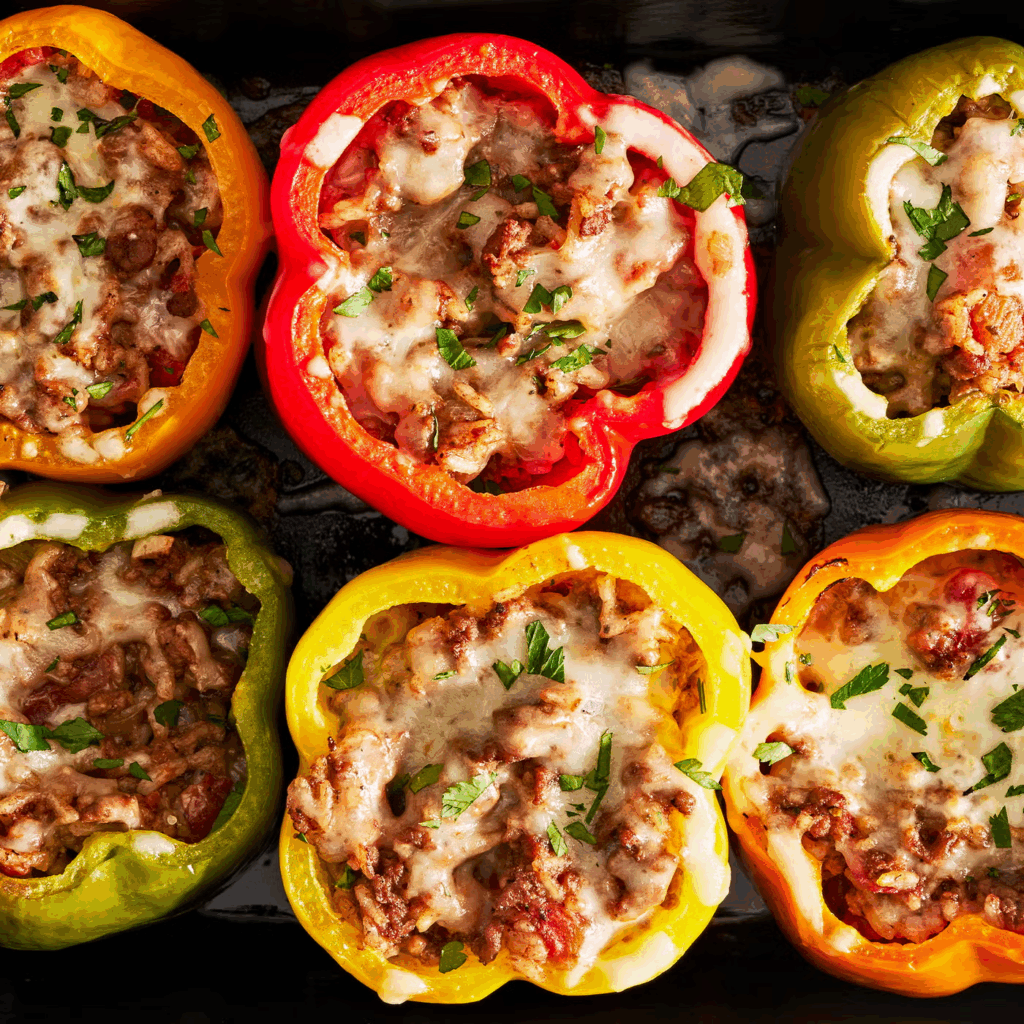 Colorful bell peppers become edible bowls filled with seasoned ground beef, rice, and tomatoes, then baked until tender. They’re naturally portioned and look impressive on the plate, making weeknight dinners feel special.